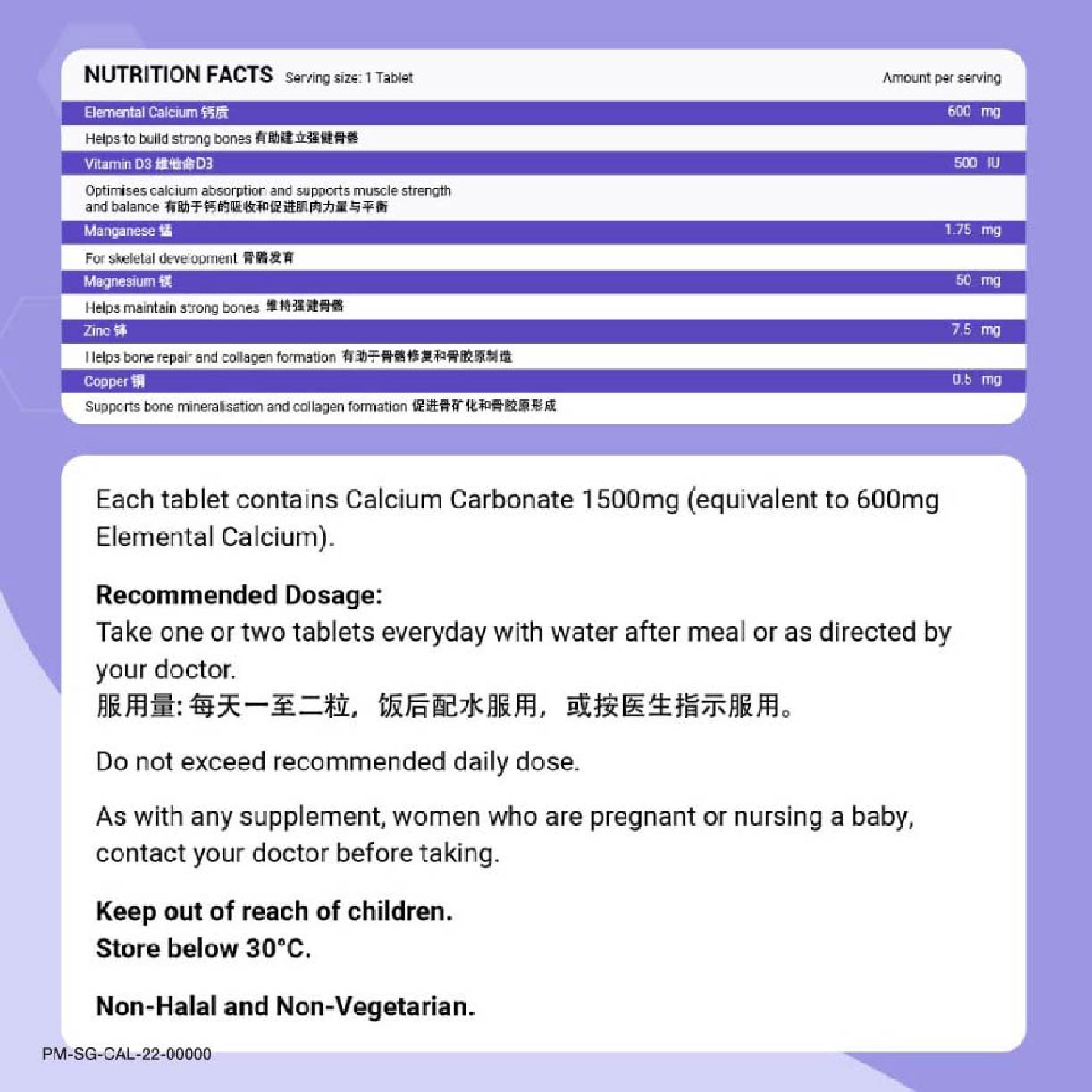 Each tablet contains 1500mg of Calcium Carbonate, equivalent to 600mg of Elemental Calcium. Caltrate Bone & Muscle Health PLUS also contains 500IU of Vitamin D3 and 4 Fortifying Minerals.