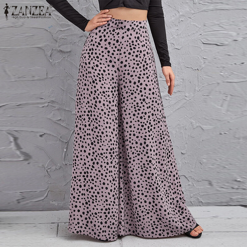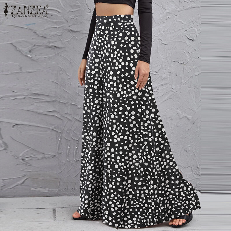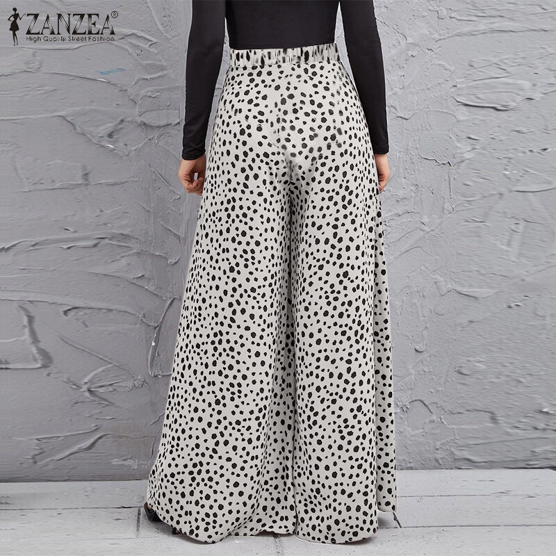 ZANZEA Women Fashion Elastic Waist Wide Leg Holiday Trousers Polka Dots Long Pants