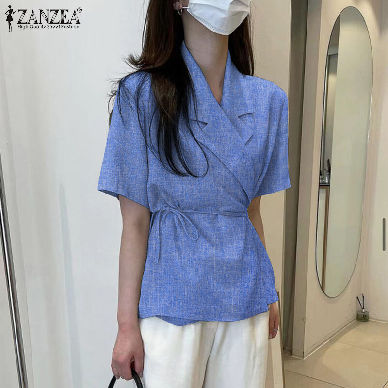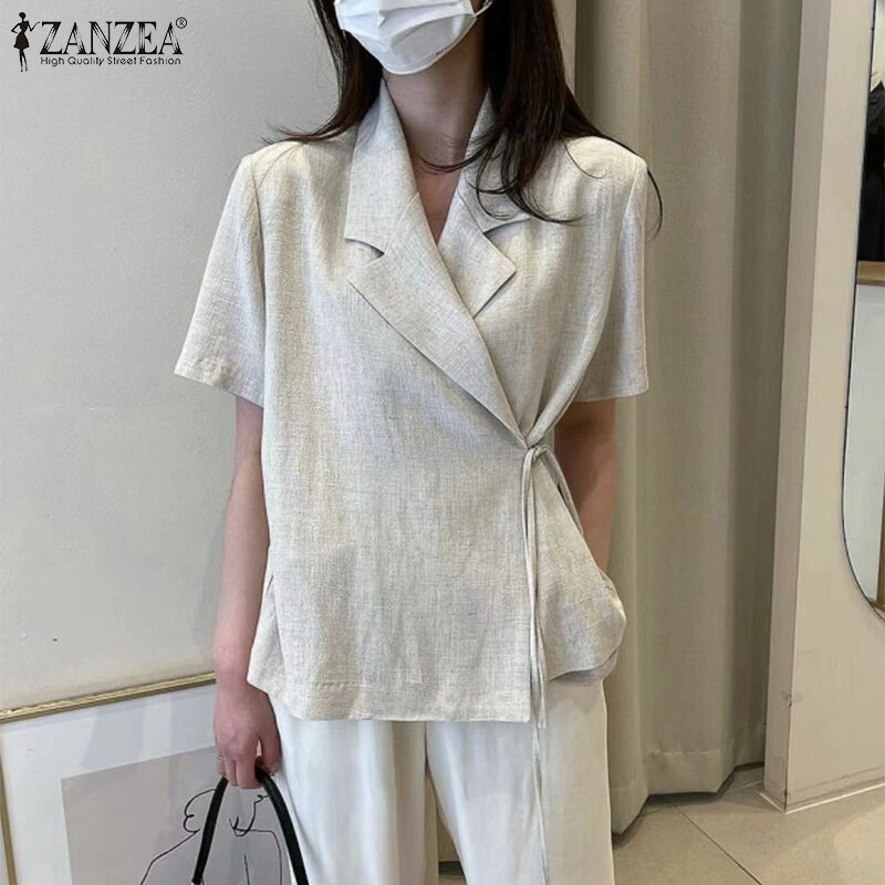 ZANZEA Korean Style Womens Short Sleeve Slims Business Office Plain Lace-up Blazer Suits